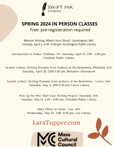 Fun FREE (in person) stuff from Swift Ink Stories coming up in April/May in Western MA and NY. All details and registration links here.